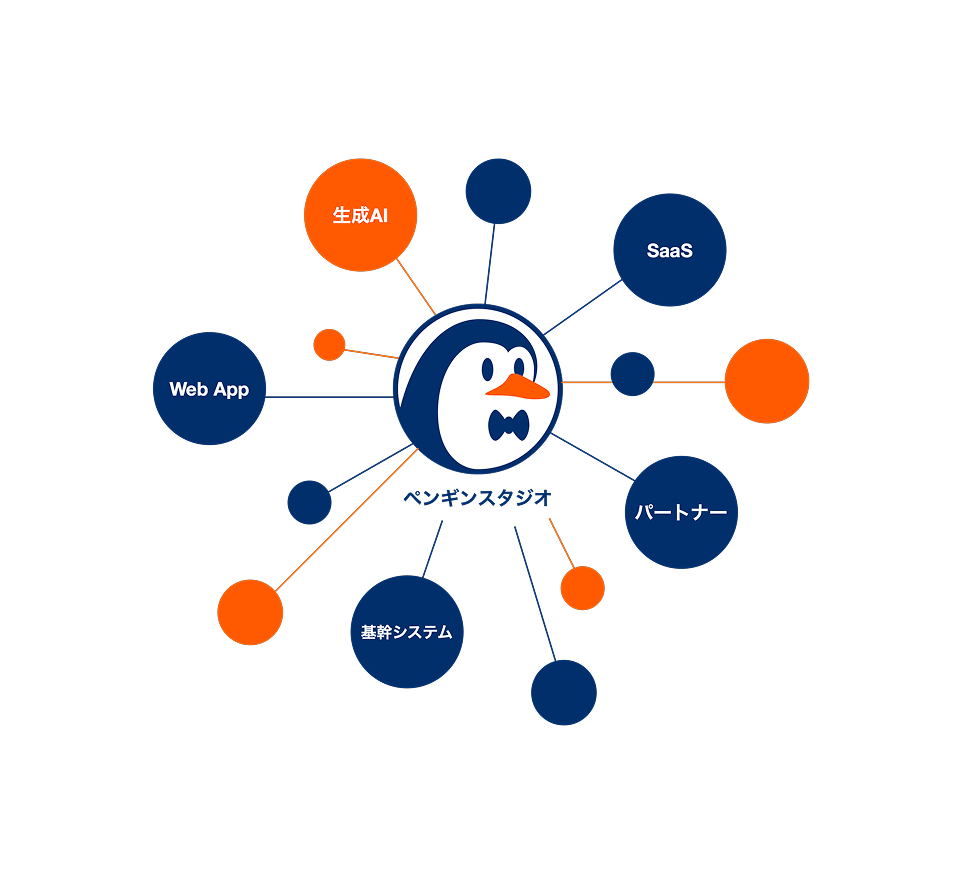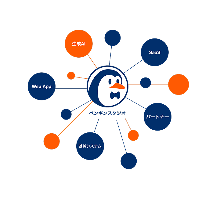 Penguin Studioは、すべてを自社内だけで抱えるのではなく、信頼できる開発パートナーと共にチームを組成します。生成AIやモダンなWebアプリのフロントエンド、基幹システムなど、特定領域に強みを持つパートナーと協働し、プロジェクトごとに最適な専門性を備えた体制を構築。全体設計とディレクションを私たちが担い、単一の窓口でプロジェクトを指揮することで、異なるバックグラウンドのメンバーが一体として機能します。専門性と柔軟性を兼ね備えた編成こそが、幅広い課題に応えられるPenguin Studioの強みです。